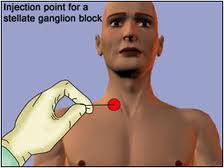 The medium frequency interferential currents should be tried before any interventional block is done. The risk of injury or further harm using interferential therapy is practically non existent. The higher medium frequency beats allow deeper penetration into the actual stellate ganglion and the decrease of pain, possibly elimination, will be known in less than 20 minutes. If the interferential current works the patient can self treat, possibly requiring no more than 2 ea. , 20 minute treatments daily until carryover pain relief is established. If the procedure does not work then traditonal interventional blocks may be done. After carryover established the pain may cease to exist or require only monthly 20 minute treatments.